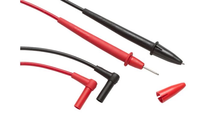 Une paire de sondes (une rouge, une noire), grip anti-dérapant et isolant PVC, cordons de test avec fiches banane gainées et coudées à angle droit